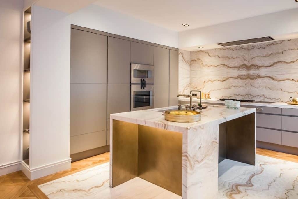 Project: Fireplace, sliding doors and kitchen island Design: Caren Pardovitch Interior Design Metal: VeroMetal Brass Finish: Patina Substrates: MDF, steel and PVC Technique: Sprayed More VeroMetal Brass projects: VeroMetal Brass, VeroMetal Brown Brass, VeroMetal Yellow Brass
